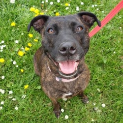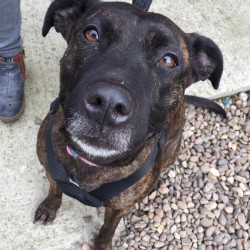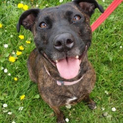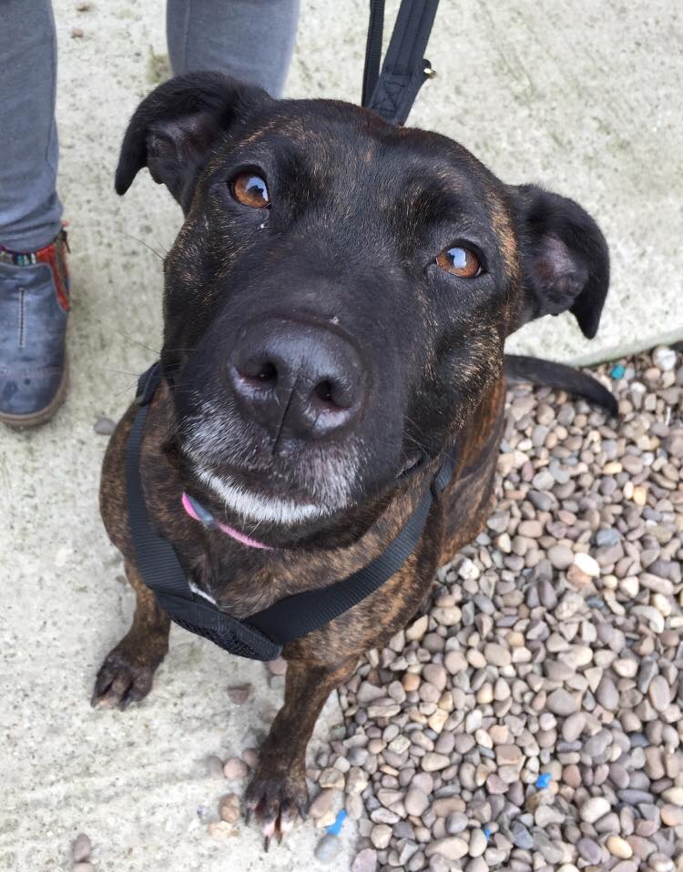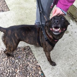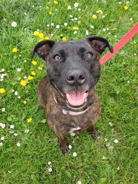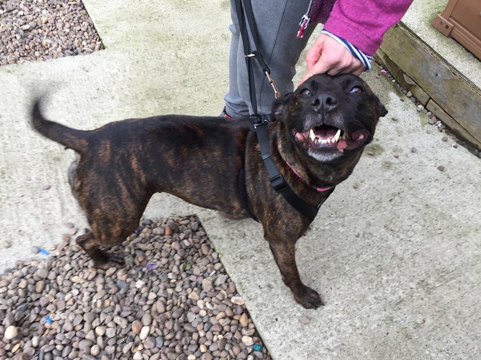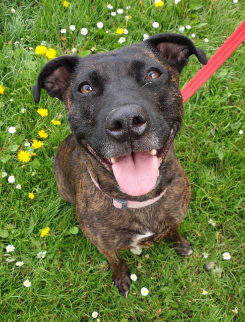 Darcy is a very special Staffy cross around 4 yrs old who could not be more deserving of finding her own ‘happy ever after’. She sadly spent 2 long years in a stray pound through no fault of her own, but is now living in a foster home where she settled in straight away and is the perfect house guest. She is fully housetrained, doesn’t chew, is quiet and is totally fine to be left for a few hours so would be a suitable dog for a family who worked. She loves having a cuddle and curling up in her bed (she even gets herself under her duvet to be extra cosy!). She LOVES to play fetch with a tennis ball and zoom around! She walks really well on the lead and doesn’t pull at all, but due to spending such a long time in stressful noisy kennels, she is reactive around other dogs, which is a work in progress and she needs to find an understanding owner who is willing to be patient and confident with Darcy to carry on her progress learning to be tolerant and calm around other dogs. Currently she needs to be the only pet and walked in quiet areas where she won’t encounter off lead dogs, and must have access to a very secure garden. Darcy is a really special girl with so much love to give – it is so unfair she’s had to spend such a long time in kennels, can you give her a chance??